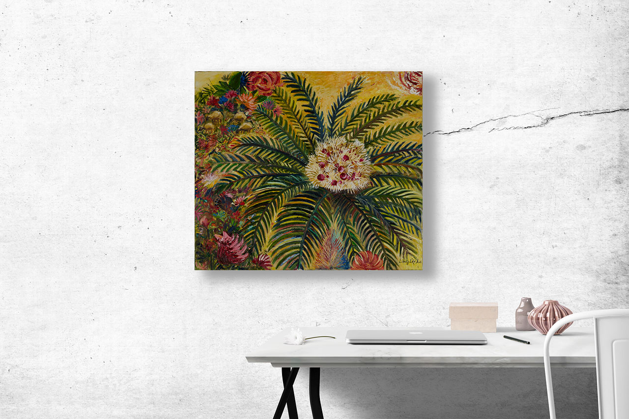 ציור נוף צבעוני בעל צבעוניות עזה וחיה. במרכז הציור דקל ביום קיץ חם ובוהק על רקע שדה פרחים פראי ובמרחק נראות כבשים רועות באחו. בהשראת ימי הקיץ בנס ציונה ונצר סירני.