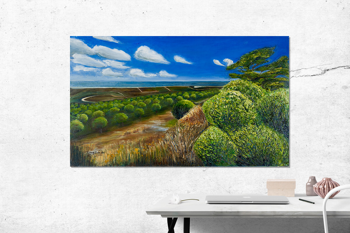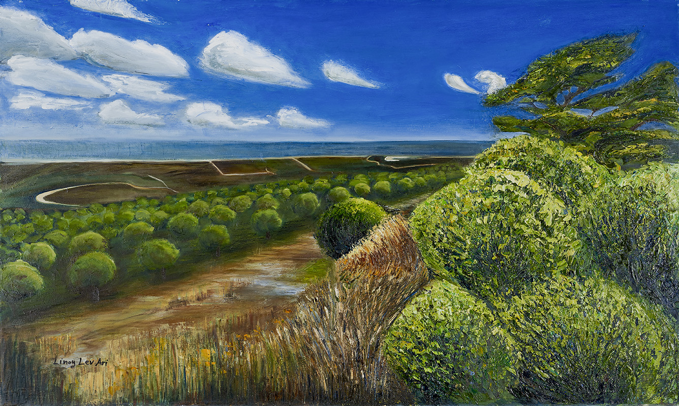 ציור נוף של החורש הטבעי בלטרון מול מטע מקומי. טקסטורה מאוד עשירה ובולטת וצבעי שמן זוהרים כחולים, ירוקים חומים וצהובים מתארים כאן את הנוף היפה של לטרון ביום יפה באמצע החורף.