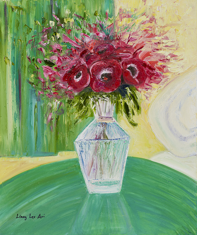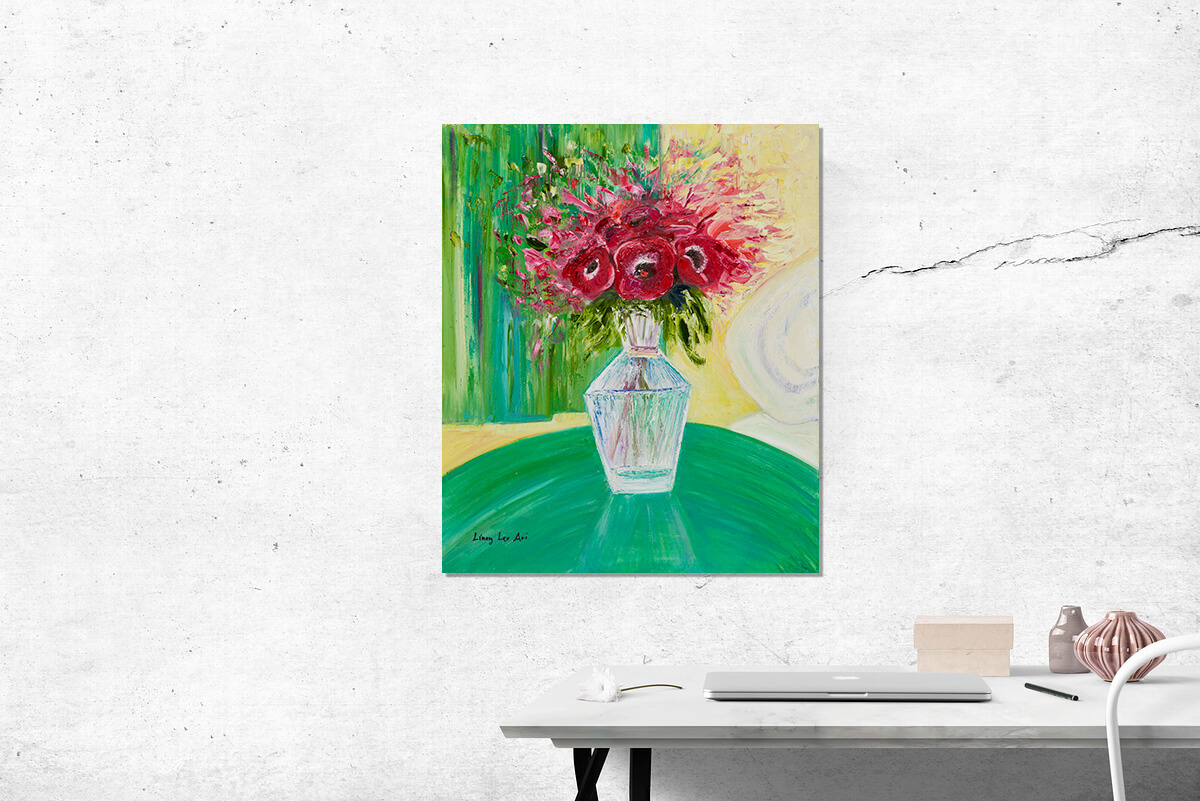 פרחים אדומים באגרטל זכוכית, וילון ירוק על קיר צהוב בהיר ושולחן טורקיז.
