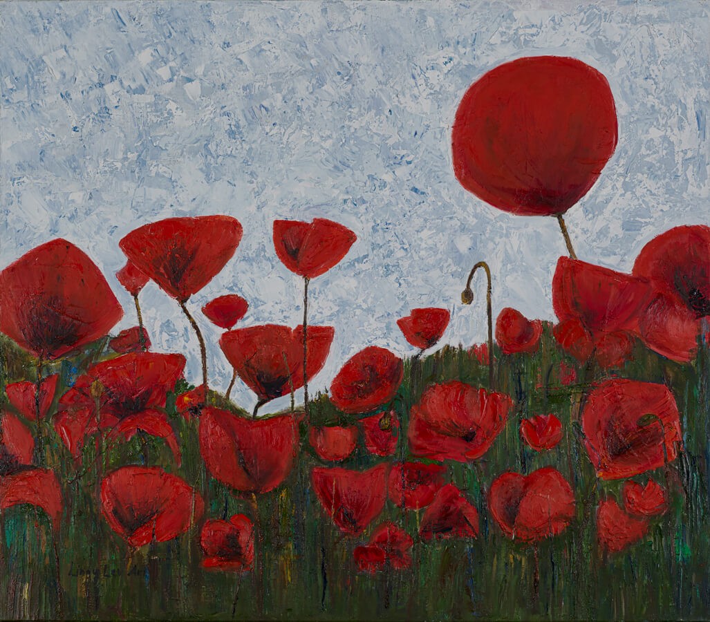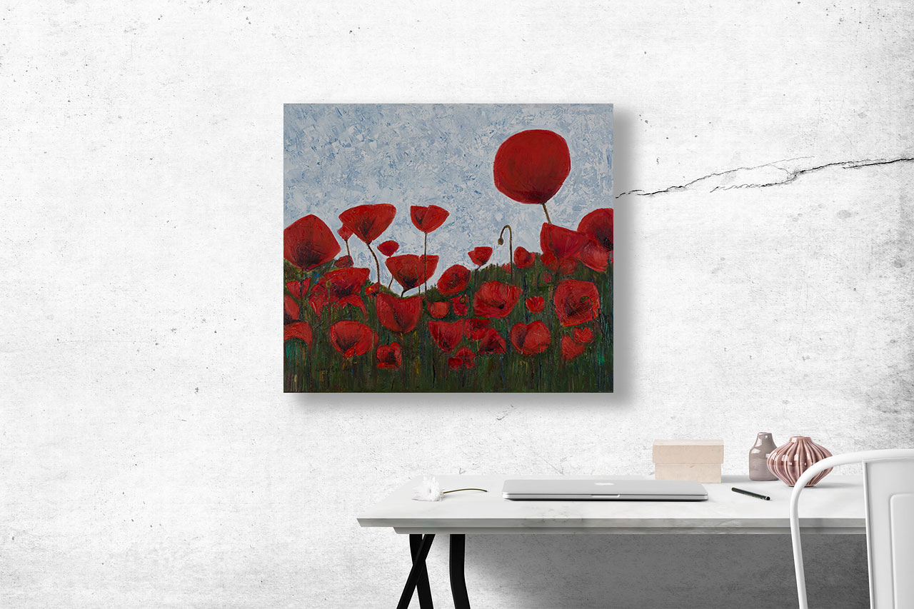 ציור נוף של שדה כלניות אדומות בשיא פריחתן. הרקע נחלק בין העשב הירוק לשמיים כחולים- אפורים של סוף החורף, ובמרכז פרוסות כלניות בעלות צבע אדום עז, עדינות אך בו בעת עוצמתיות.