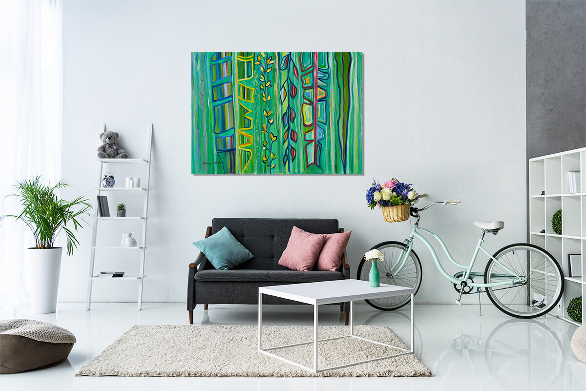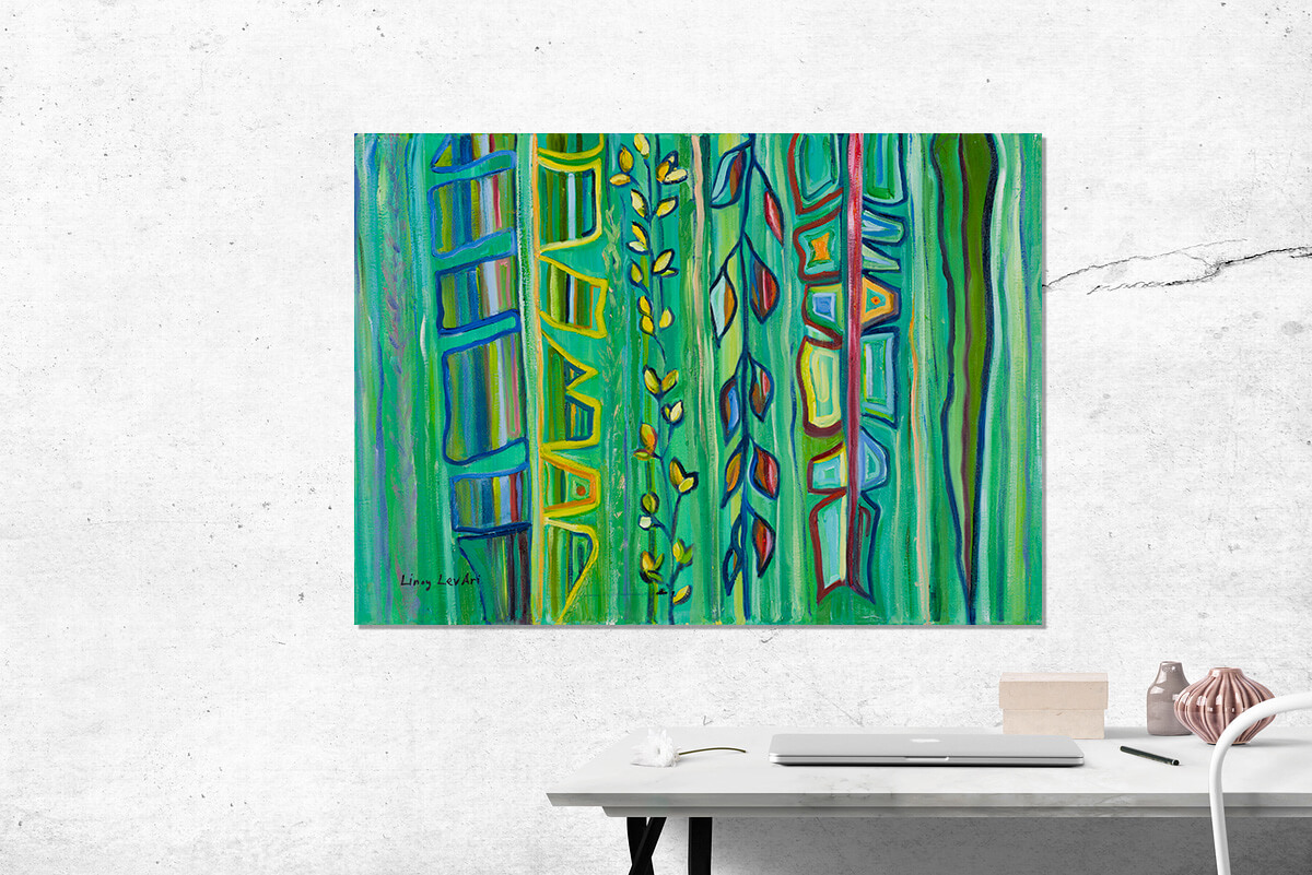 ציור דקורטיבי המתאר עלים וצמחים זה לצד זה עולים ויורדים לאורך רקע של פסים לאורך.